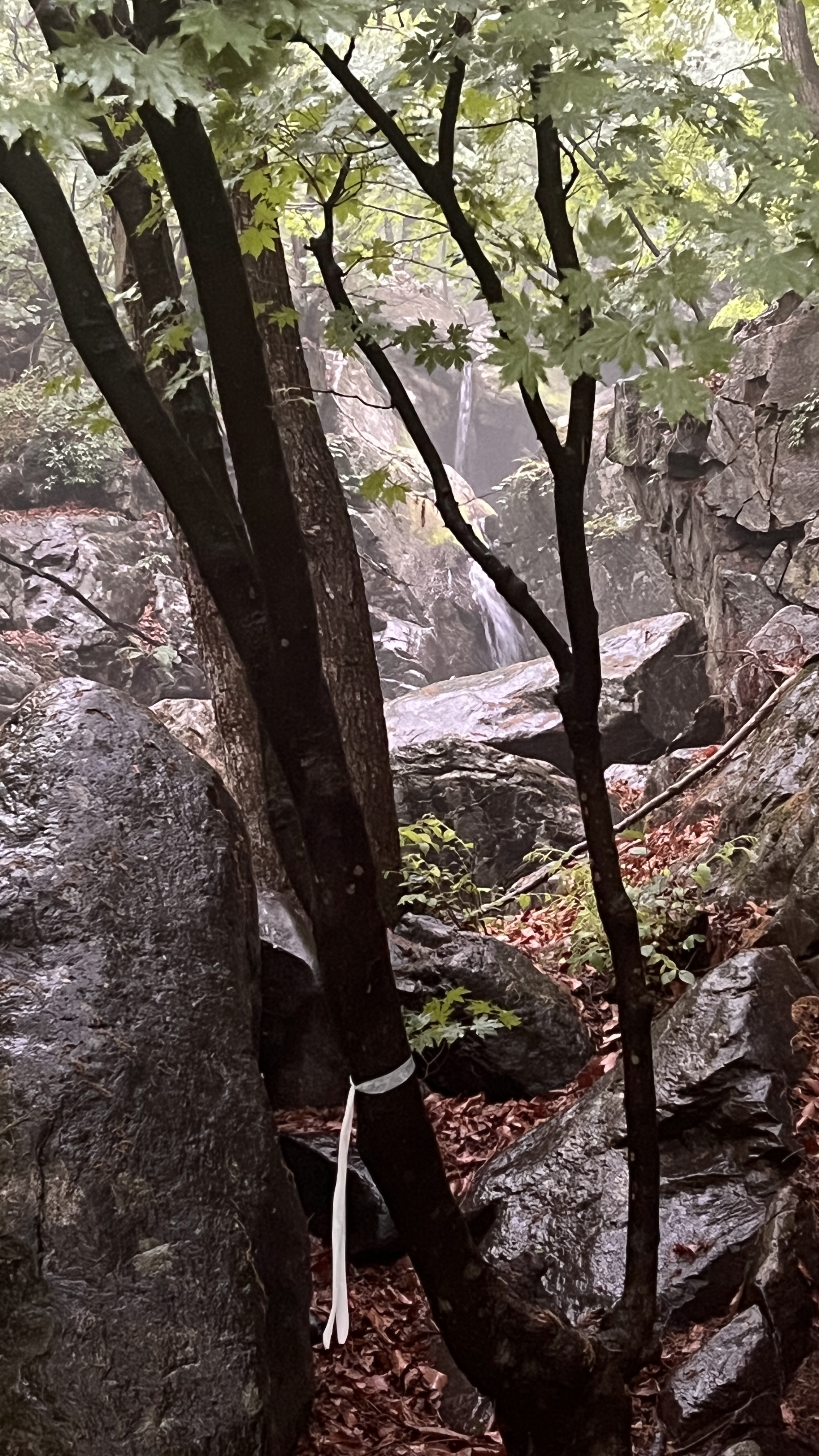 내려올 때는 비가 많이 내려서 조심조심 내려오다보니 시간이 올라갔던 그만큼 똑같이 걸렸다. 한참을 집중해서 내려오다보니 명지 폭포에 다다랐는데, 처음엔 폭포처럼 보이는게 명지 폭포인지 몰라서 그냥 계곡인가보다 했다가 아빠가 명지 폭포가 맞는 것 같다며 멈춰서서 멀리서 구경했다. 비가 많이 오고 있어서 다가가지는 않고 멀리서 바라봤지만, 그래도 명지 폭포를 보고 왔다!
